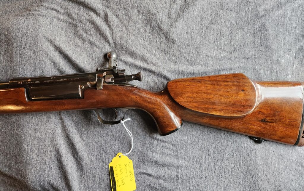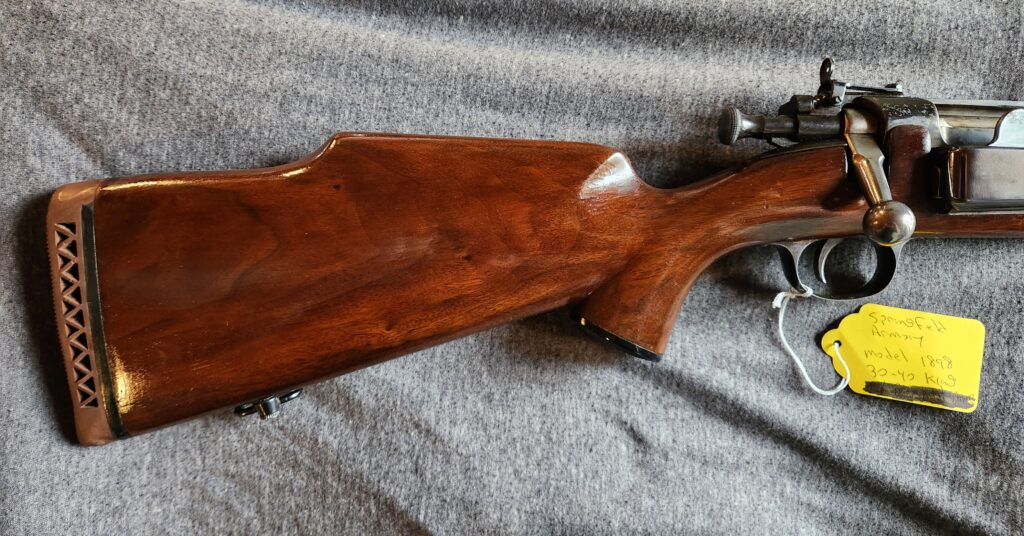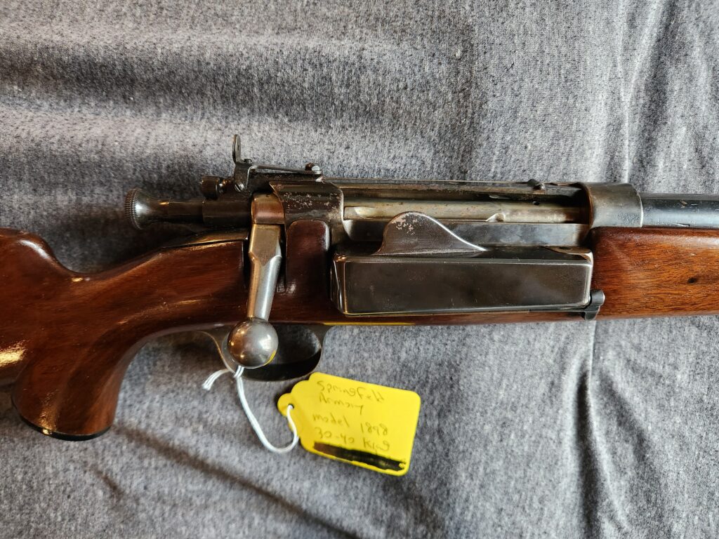 #1 – Krag-Jorgensen Model 1898, 30-40 Krag caliber, has been “sporterized”, some rust on barrel, includes ammo. Book value $500. Bids start at $400.